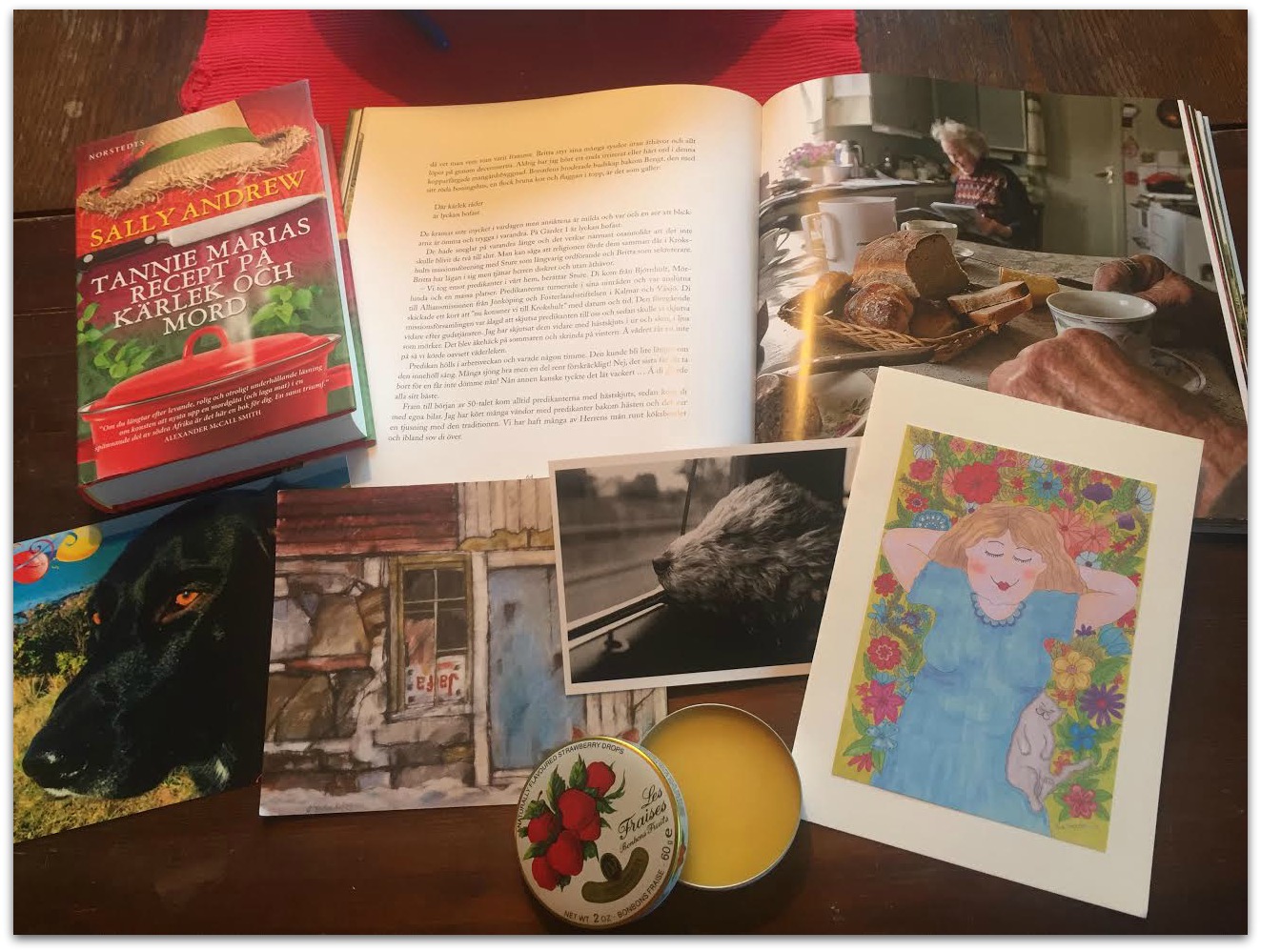 Annat som gjorde och gör hjärtat glatt: underbara målningen från Eva påp Frösön som visar hur jag ligger i gröngräset bland blommor och blader och med sigge intill mig ..., där är ringblomssalva från min förste-förste-äktamans (han som jag gifte mig med i sju års ålder kanske) hustru Elisabeth med h ., där är en bok från trogna vännen Inger i Skellefteå , ett härligt harrykort från Ystad och så kom friherrinnan cyklande (återigen!!) med en egenhändigt gjord tulpanbukett med liten pippi i .., bara så fin!