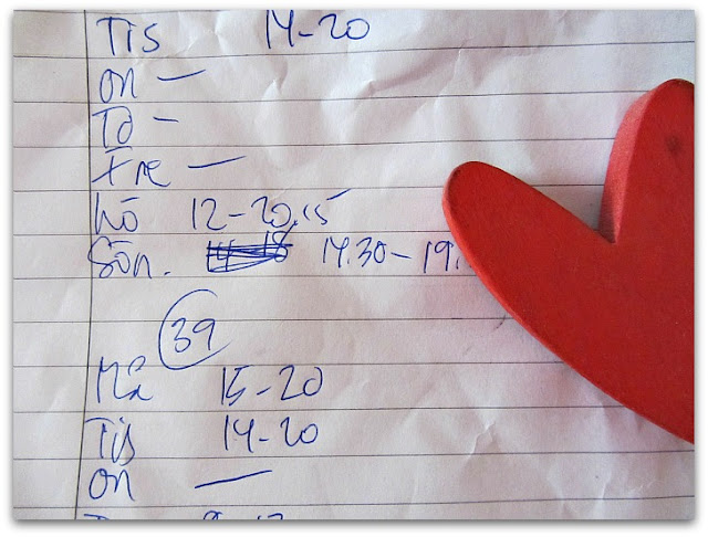 På kylskåpsdörren sitter schemat för vecka 38 och 39, ja, delar av det.